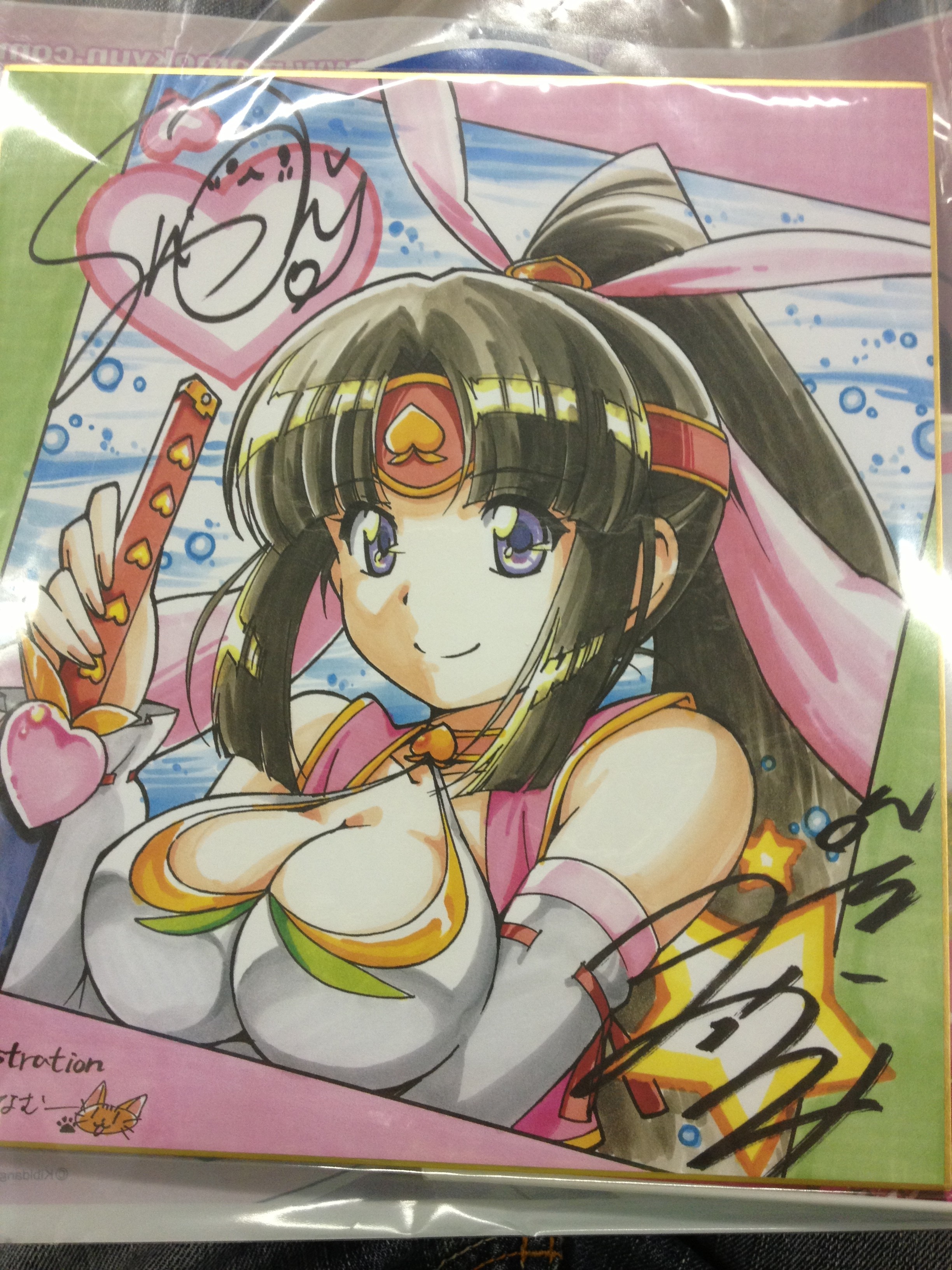 Shikishi ze stánku Momokyun Sword s nakopírovaným podpisem Mikami Shiori